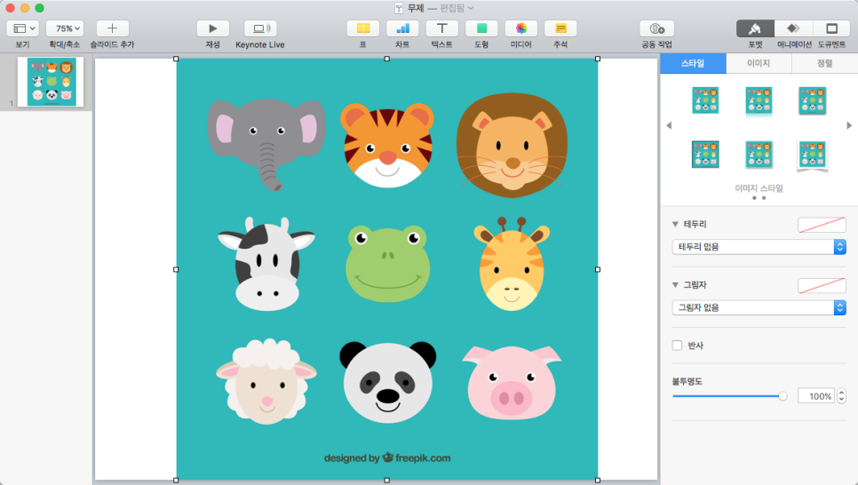 MS 파워포인트보다는 종류가 많지 않지만, 꼭 필요한 모양만 있어서 디자인 응용, 사용에는 큰 문제는 없습니다. 그래도 좀 다양하게 지원해 주었으면 하는 아쉬움은 있습니다.