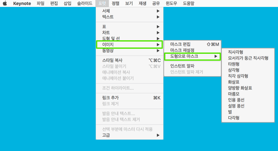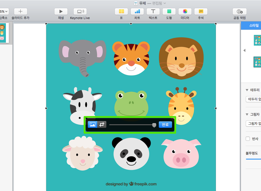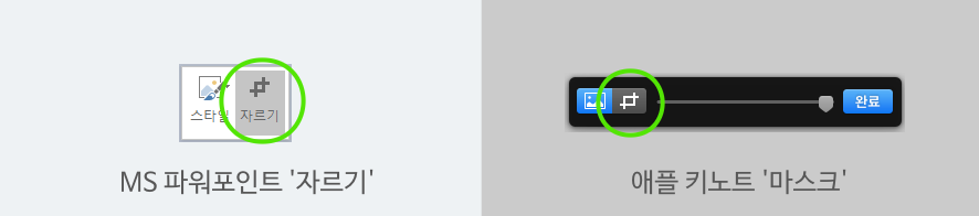 파워포인트의 자르기와 같은 기능으로 '크롭' 아이콘 모양(이미지 에디터도 거의 동일)을 하고 있습니다. 아쉽게도 파워포인트 만큼 많은 모양이 있지는 않지만, 충분히 키노트용으로 사용할 수 있습니다.
