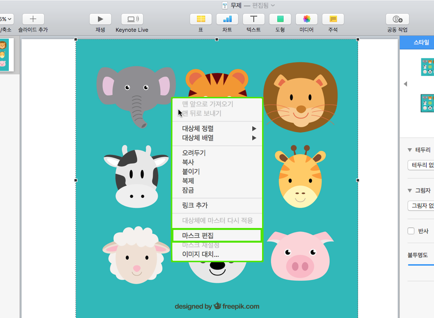 만약 위치가 마음에 들지 않거나 다른 이미지를 선택해주고 싶은 경우는 이미지를 두 번 클릭 또는, 오른쪽 마우스 메뉴에서 '마스크 편집'을 선택해 수정하시면 됩니다.
