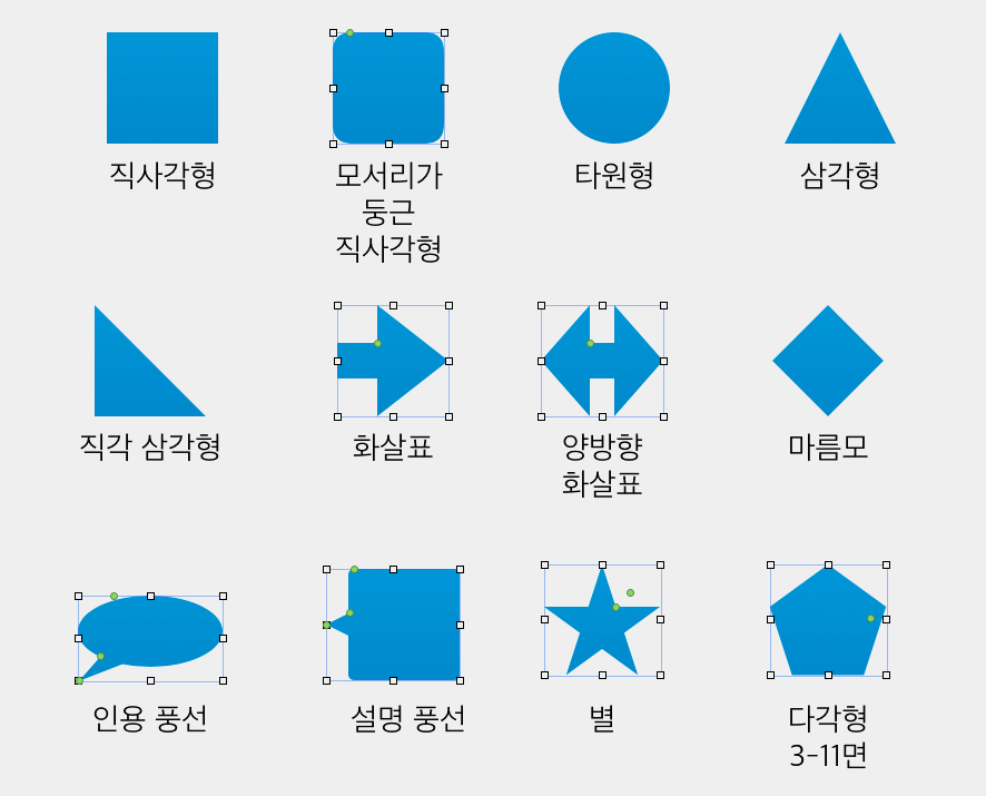 MS 파워포인트보다는 종류가 많지 않지만, 꼭 필요한 모양만 있어서 디자인 응용, 사용에는 큰 문제는 없습니다. 그래도 좀 다양하게 지원해 주었으면 하는 아쉬움은 있습니다.