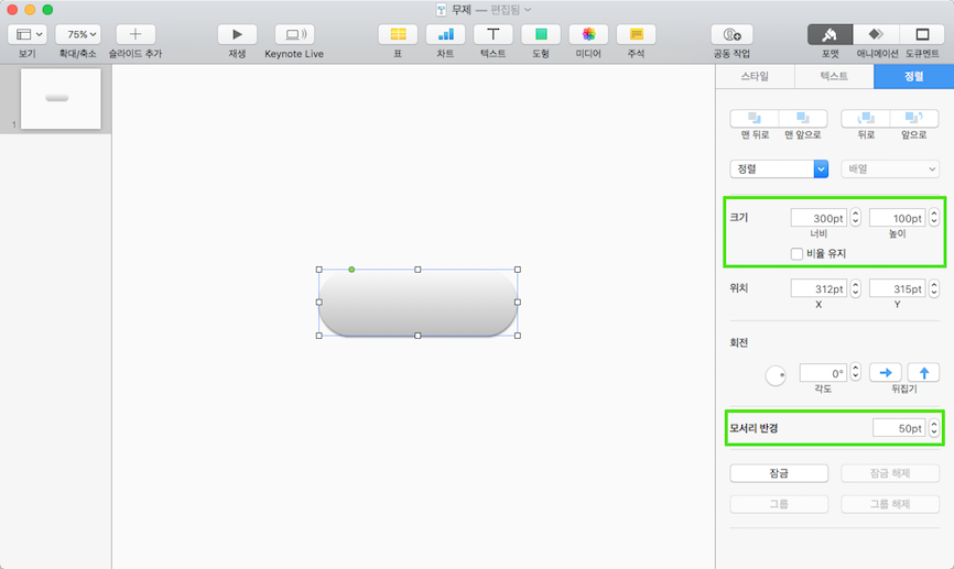 크기를 너비:300pt / 높이:100pt / 모서리 반경:50pt 로 변경합니다.