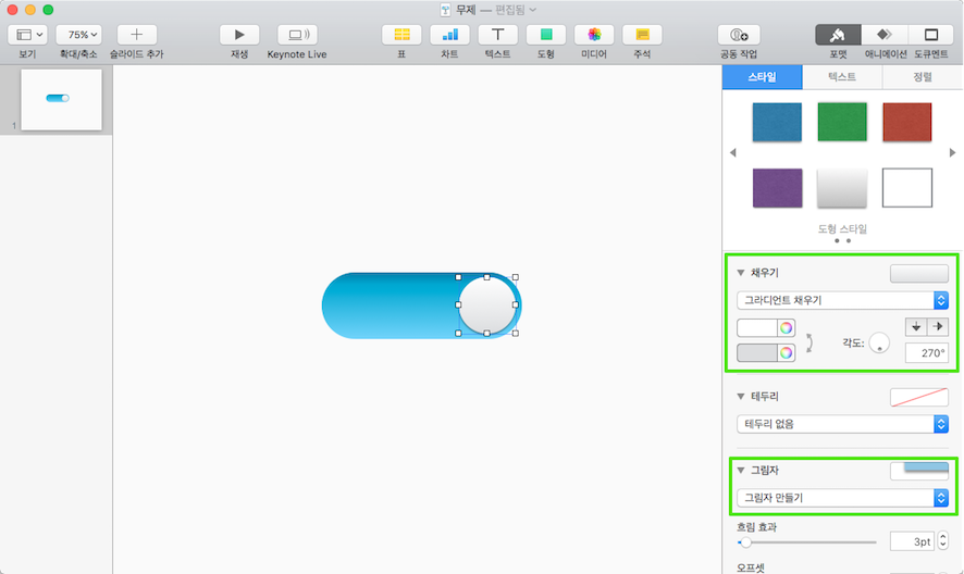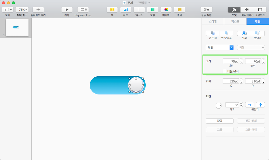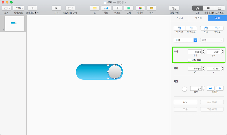 도형에서 회색 그라디언트 타원형을 선택, 크기를 너비:85pt/높이:85pt 로 변경을 하고, 위치는 모서리가 둥근 직사각형 오른쪽 끝에 완전히 붙지 않도록 합니다. 키노트는 도형이 움직일 때 팝업으로 위치를 알려줌으로 보면서 적당한 간격으로 이동합니다.(약7pt)
