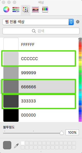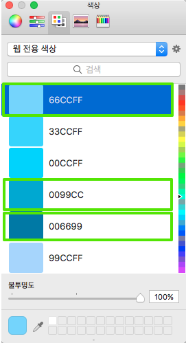 '고급 그라디언트 채우기'를 선택하고 반전(또는 각도:90도)으로 변경 후 색상표에서 '웹 전용 색상'을 선택, 오른쪽부터 차례대로 푸른색을 넣습니다. 안쪽 그림자 효과를 주기 위해 가장 왼쪽에 있는 색과 중간색은 최대한 왼쪽으로 가깝게 붙입니다.
