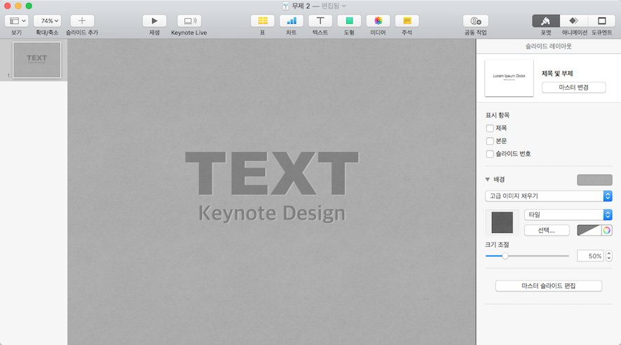 키노트를 사용하면서 가장 아쉬운 부분은 글씨(폰트) 효과가 많지 않아 다양한 디자인을 할 수 없다는 것입니다.
