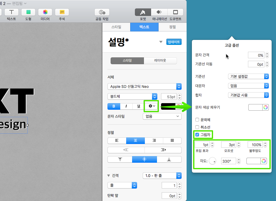왼쪽 위에 빛이 들어와 생기는 음각 느낌을 위해서, 글씨를 선택하고 톱니바퀴 모양의 아이콘을 눌러 '고급 옵션'을 선택합니다.