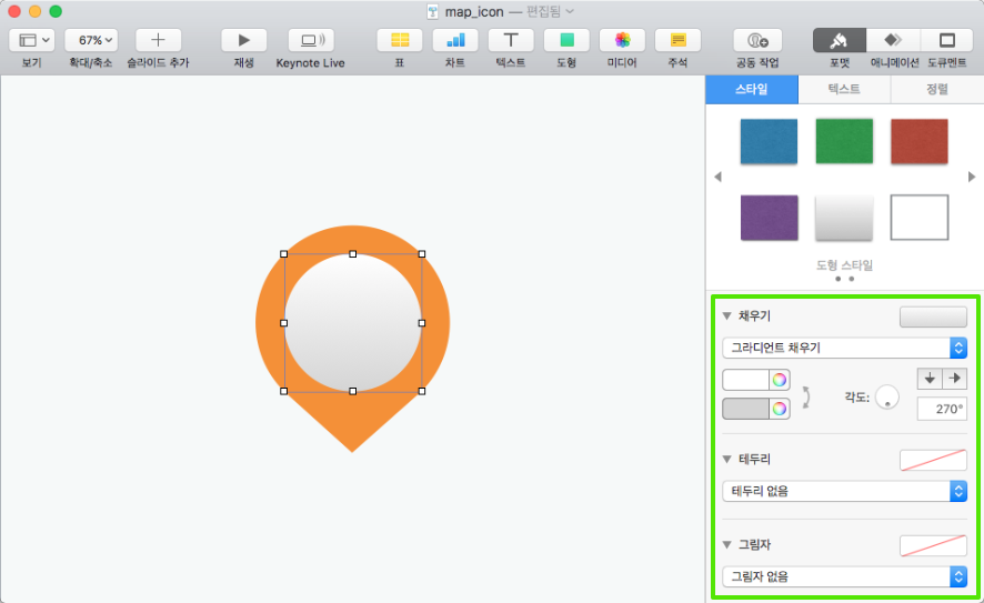 원하는 배경을 넣으면 완성! 사실 이번 강좌는 지도 아이콘 만들기보다 '도형 편집'을 이해하는 것이 내용의 핵심입니다. 도형 편집을 이해하면 다양한 모양의 아이콘, 배경 등을 키노트에서 쉽고 빠르게 디자인할 수 있습니다.