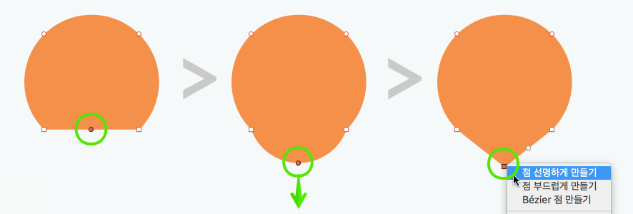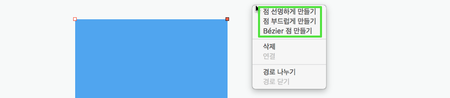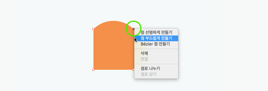 편집하고 싶은 포인트를 선택하고 마우스 보조 클릭(오른쪽)을 하면 점의 모양을 변경할 수 있는 팝업이 나옵니다.