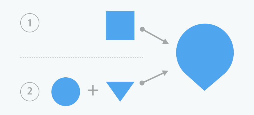 이제 지도 아이콘을 본격적으로 만들어 보도록 하겠습니다. 위의 '도형 편집'에 관한 내용을 이해하셨다면, 위 예시 ①번처럼 사각형만 이용해 '지도 아이콘'을 만들 수 있습니다. 바로 감이 오시는 분들이 꽤 있으실 듯합니다.
