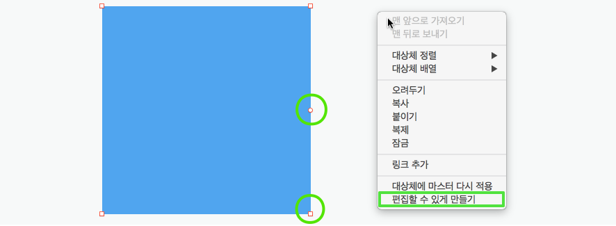 도형 편집은 도형의 가장자리를 마우스로 클릭하거나 도형을 선택해 마우스 보조 클릭(오른쪽)을 누르면 팝업 메뉴에 '편집할 수 있게 만들기'를 선택하면 활성화가 됩니다. 또한, 도형 편집이 활성화된 상태에서 점과 점 사이에 마우스 포인트를 가져가면 가운데에 빨간색의 편집 원형 점이 자동 생성됩니다.