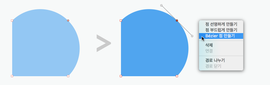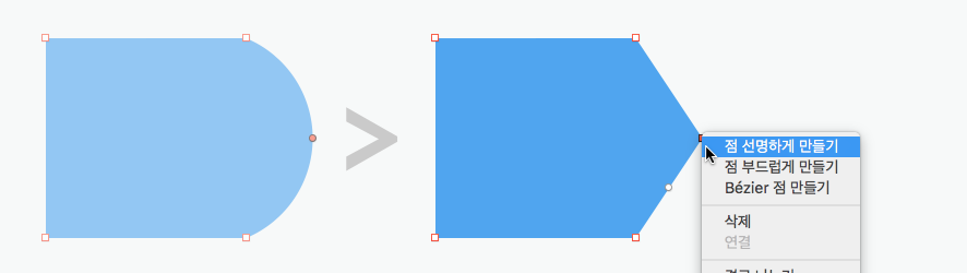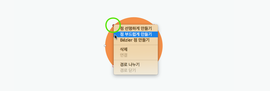 편집하고 싶은 포인트를 선택하고 마우스 보조 클릭(오른쪽)을 하면 점의 모양을 변경할 수 있는 팝업이 나옵니다.