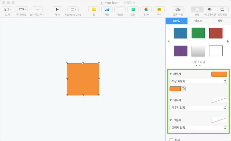 정사각형을 넣어 주고 원하는 색을 선택합니다. 테두리와 그림자는 '없음'으로 해줍니다.