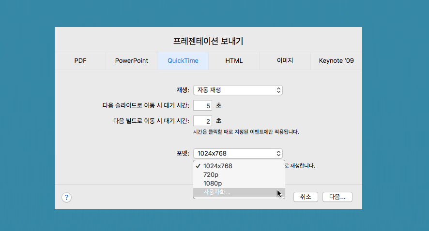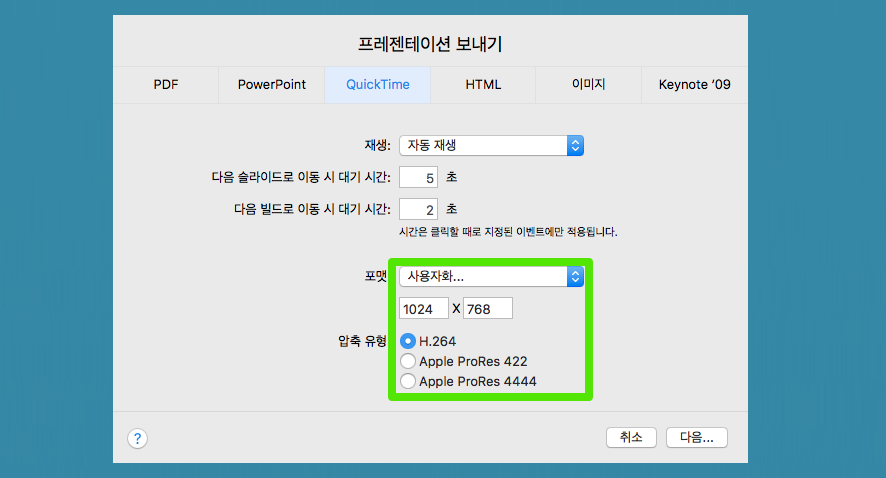 '사용자화...'에서는 다양한 비디오 압축 포맷을 지원하여, 저장후 애플 파이널 컷이나 iMovie에 사용할 수 있습니다.