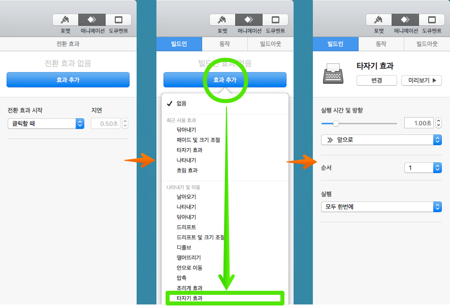 iPhone 글씨를 클릭 '효과 추가'에서 '타자기 효과'를 추가합니다. 순서는 첫 번째로 나와야 하므로 1을 선택하고 원하는 실행 시간 및 방향을 선택합니다.