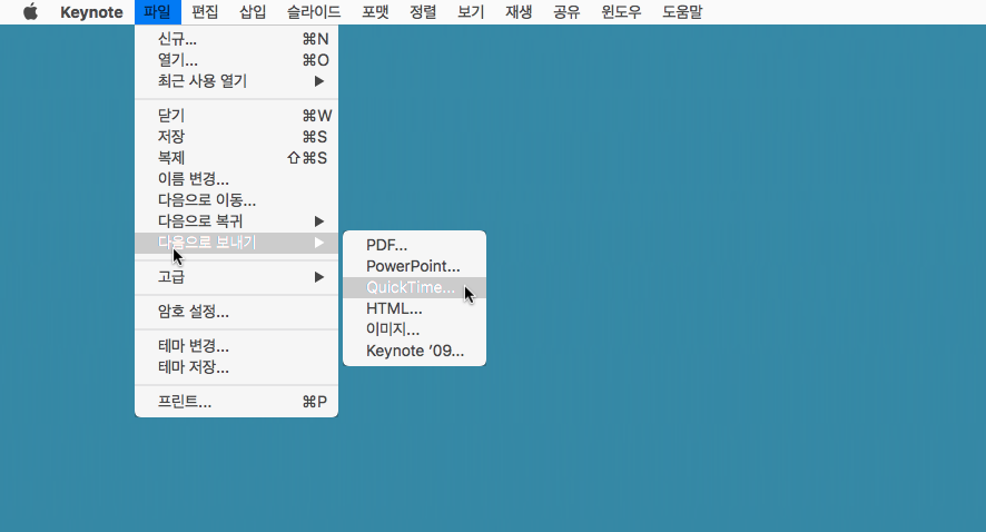 영상을 저장하기 위해서는 애플 퀵타임으로 저장을 해야 합니다. 파일>다음으로 보내기>QuickTime...