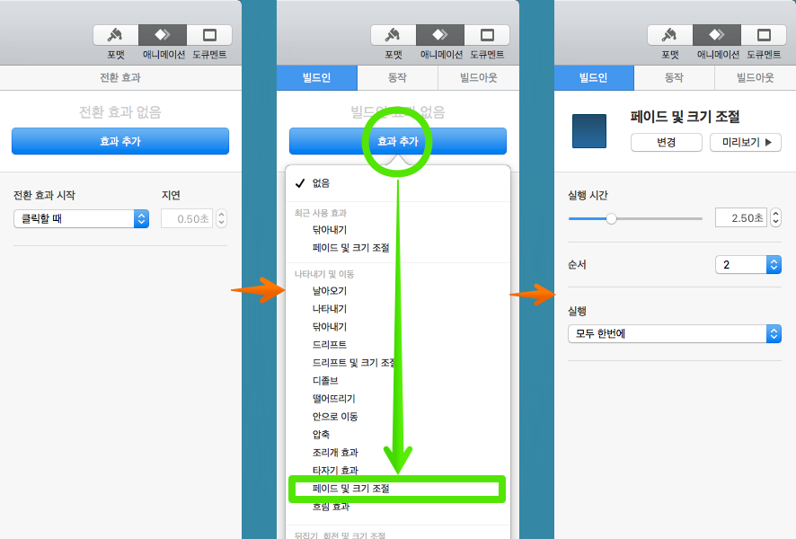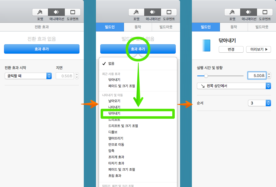 아래 키노트를 참조로 다양한 애니메이션을 적용해 보시기 바랍니다.