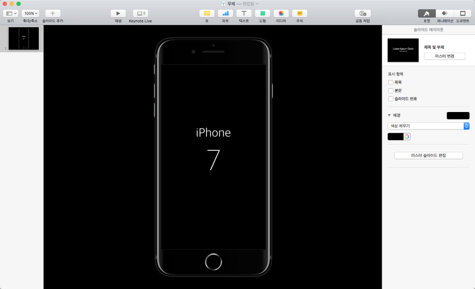저번에 제가 만든 아이폰7 키노트를 이용해 '아이폰7 인트로 애니메이션'을 만들어 보도록 하겠습니다. 결과물은 이해하기 쉽도록 키노트 파일을 첨부했습니다.