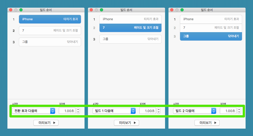 빌드 순서를 클릭하면 팝업 창이 나옵니다. 각각의 오브젝트 순서를 어떻게 진행을 할지 정하는 것인데요. 여기서는 영상을 만들기 위함이니 시작 효과를 '클릭할 때'가 아닌 '다음에'로 지정을 합니다. 지연 시간도 1초씩 지정을 했습니다. (프레젠테이션용으로 사용하려면 '클릭할 때'로 지정하시면 됩니다) 완료를 했으면 '미리보기' 또는 상단의 '재생'을 눌러 확인합니다.